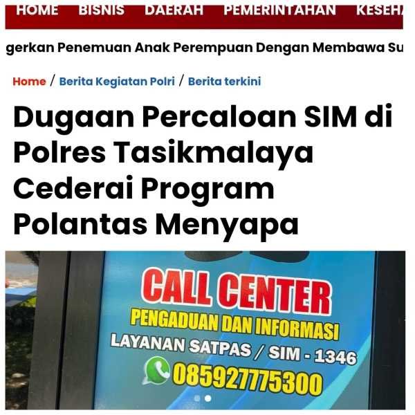 Berita dengan judul ‘Dugaan Percaloan SIM di Polres Tasikmalaya Cederai Program Polantas Menyapa’ itu ditayangkan media massa online www.tabloidputrapos.com pada Sabtu, 18 Oktober 2025. Narasi dalam berita menuliskan pemohon berinisial L berinteraksi dengan seorang oknum calo di luar Polres yang menawarkan jasa bikin SIM C di angka Rp900.000.