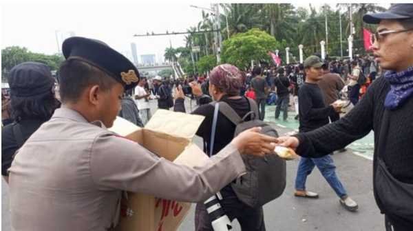 The humane action of Polri security personnel distributing mineral water and bread to protesting workers from the Confederation of the Indonesian Trade Union Alliance Congress (KASBI) is concrete, empirical evidence of the humanitarian theory of the humanist approach proposed by the Kapolda Metro Jaya, Irjen Pol Asep Edi Suheri.