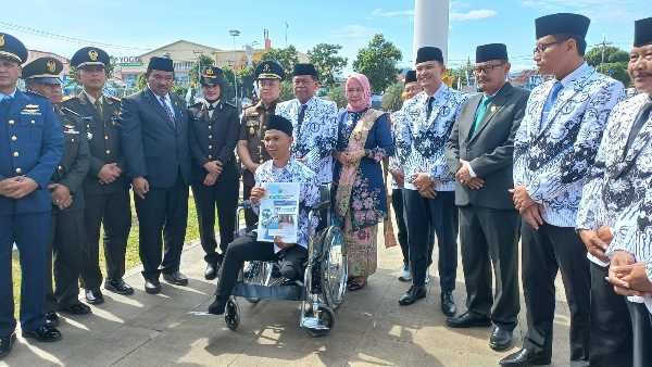 Pada kesempatan tersebut juga diserahkan penghargaan dan bantuan kursi roda buat guru yang mengalami kecelakaan saat tugas. (Bram)