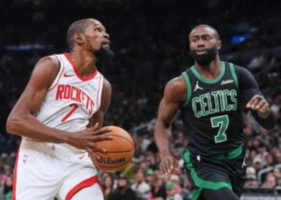 Houston Rockets star Kevin Durant battles Boston Celtics star Jaylen Brown.