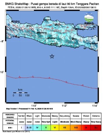 progresifjaya.co.id, PACITAN – Gempa bumi mengguncang kawasan pesisir selatan Pulau Jawa, tepatnya di Kabupaten Pacitan, Jawa Timur, pada Jumat dini hari, 6 Februari 2026, dengan magnitudo (M) 6,4.