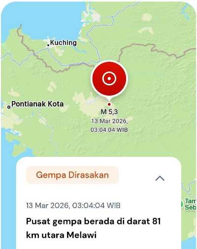 progresifjaya.co.id, PONTIANAK – Gempa berkekuatan magnitudo 5,3 mengguncang Kabupaten Melawi serta Kabupaten Sintang dan sekitarnya pada Jumat (13/3) dini hari, sekira pukul 03.00 WIB.