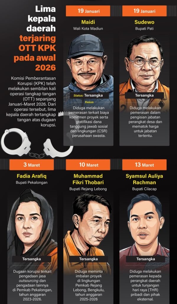 Sedangkan yang terakhir adalah Bupati Cilacap Syamsul Auliya Rachman yang terkena OTT KPK pada 13 Maret 2026. Syamsul memerintahkan pengumpulan uang dari SKPD di lingkungan Pemkab Cilacap untuk THR bagi Forkopimda serta kepentingan pribadi.