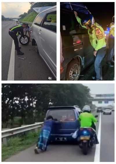 The swift action of the Subang Polres Traffic Unit Chief, AKP Hardian Andrianto, and the Head of the Subang Police Traffic Registration Identication Unit, Iptu Eko, assisting residents on the Cipali Toll Road during the Eid homecoming period.