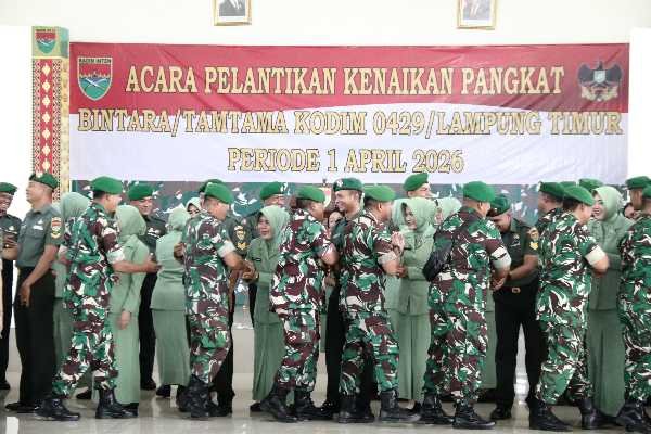 progresifjaya.co.id, LAMPUNG TIMUR – Acara pelantikan kenaikan pangkat Bintara dan Tamtama yang dipimpin langsung oleh Dandim 0429/Lamtim Letkol Inf Danang Setiaji, S.I.P., M.I.P., berlangsung di Aula Gatot Subroto, Makodim, Senin (6/4/2026).