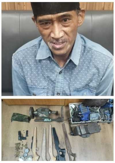 Pelaku TS alias Ki Bedil yang cukup terkenal sebagai produsen senpi ilegal di kalangan para pelaku street crime dan juga pemburu ilegal (atas). Sejumlah barang bukti yang berhasil disita dari bisnis senpi ilegal Ki Bedil (bawah).