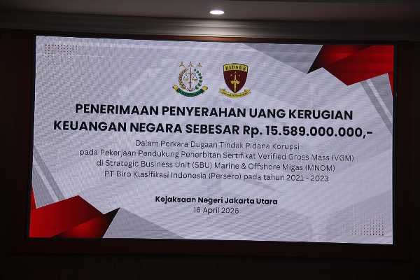 progresifjaya.co.id, JAKARTA – Kejaksaan Negeri (Kejari) Jakarta Utara menerima pengembalian kerugian keuangan negara sebesar Rp 15,5 miliar terkait perkara dugaan korupsi penerbitan Sertifikat Verified Gross Mass (VGM) atau dokumen berat kargo kapal di PT Biro Klasifikasi Indonesia (PT BKI), Kamis (16/4-2026).