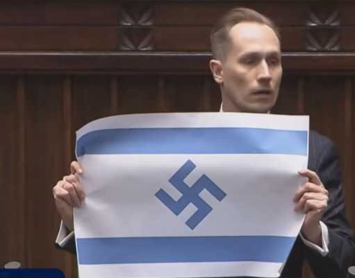 Anggota parlemen itu membentangkan bendera Israel yang telah dilukis gambar lambang Nazi.