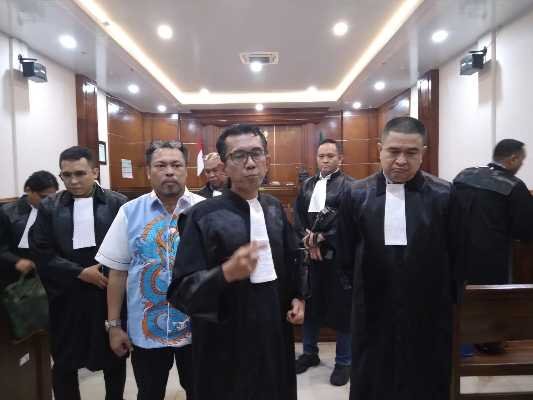 Terdakwa Hendra Sianipar, S.H (baju batik biru berlengan putih) didampingi Tim advokat dari DPN PERADI Suara Advokat Indonesia.