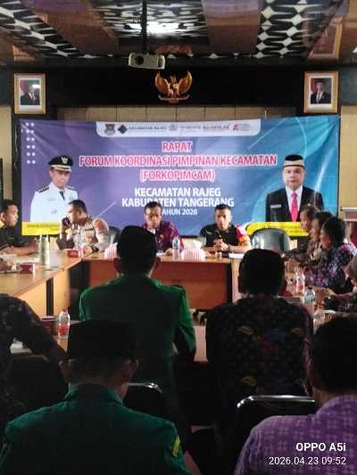 progresifjaya.co.id, KAB. TANGERANG – Camat Rajeg Oman Apriaman memimpin rapat Forum Koordinasi Pimpinan Kecamatan (Forkopimcam) di Aula Kantor Kecamatan Rajeg, Kamis (23/4/2026).