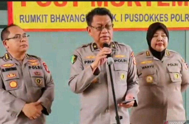 The Head of the Kramat Jati Polri Hospital, Brigjen Pol Prima Heru Yulihartono, accompanied by the Head of the Medical and Health Division of the Polda Metro Jaya, Kombes Pol Martinus Ginting, while giving a statement at the Polri Hospital.