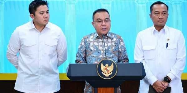 Deputy Speaker of the DPR RI, Sufmi Dasco Ahmad, along with Minister of State Secretary Prasetyo Hadi and Cabinet Secretary Teddy Indra Wijaya, deliver a press statement regarding developments in the legal cases involving several officials of PT ASDP Indonesia…